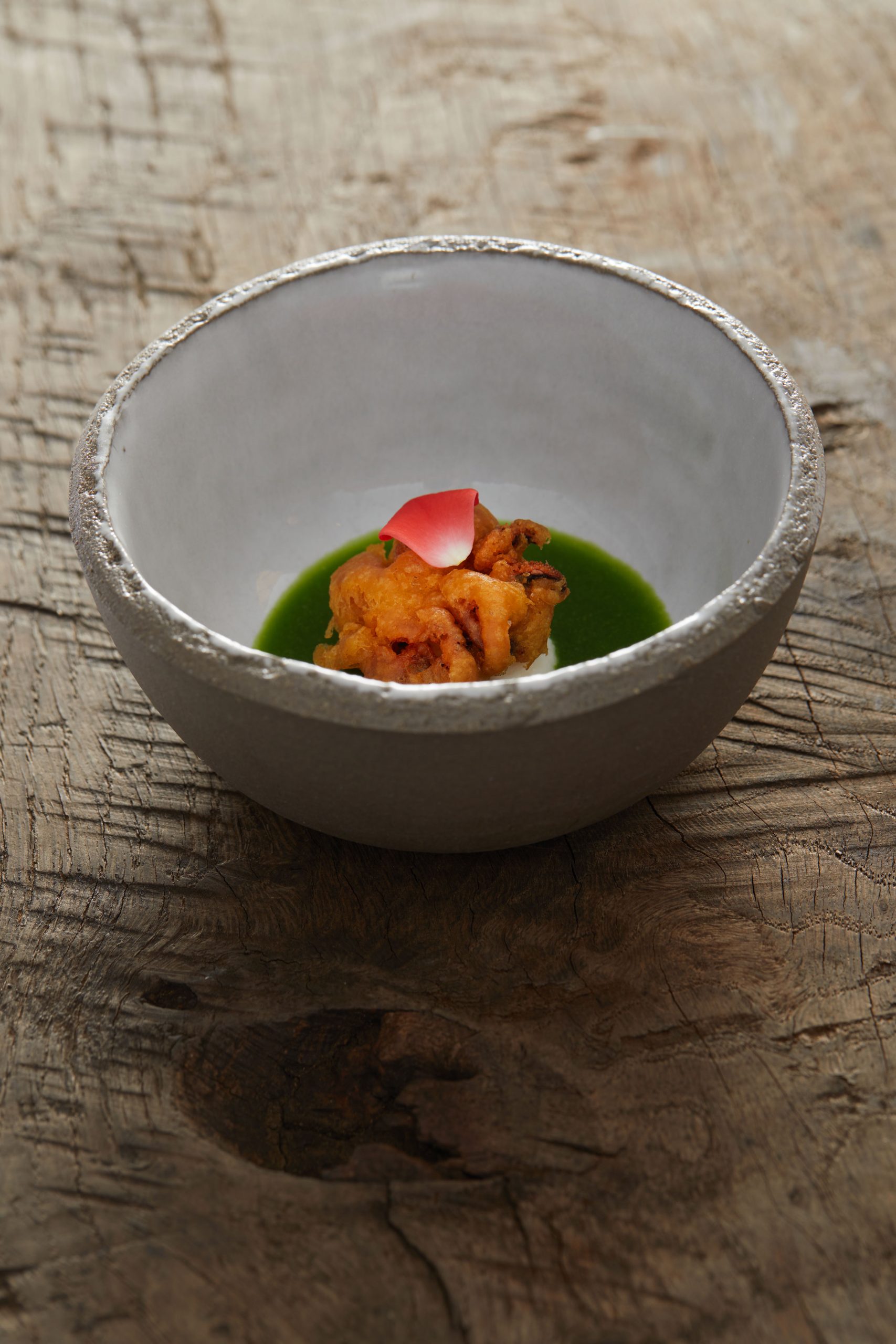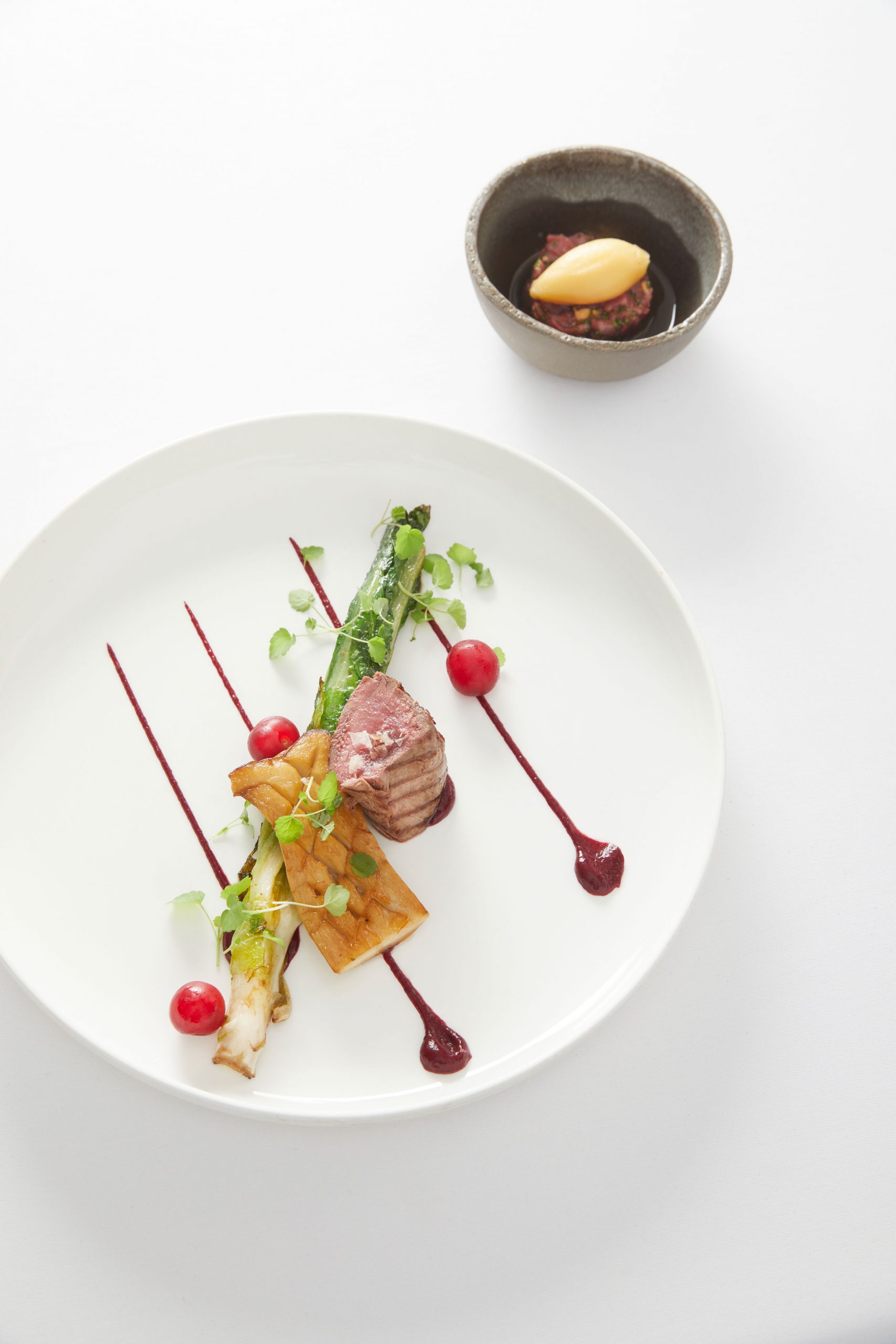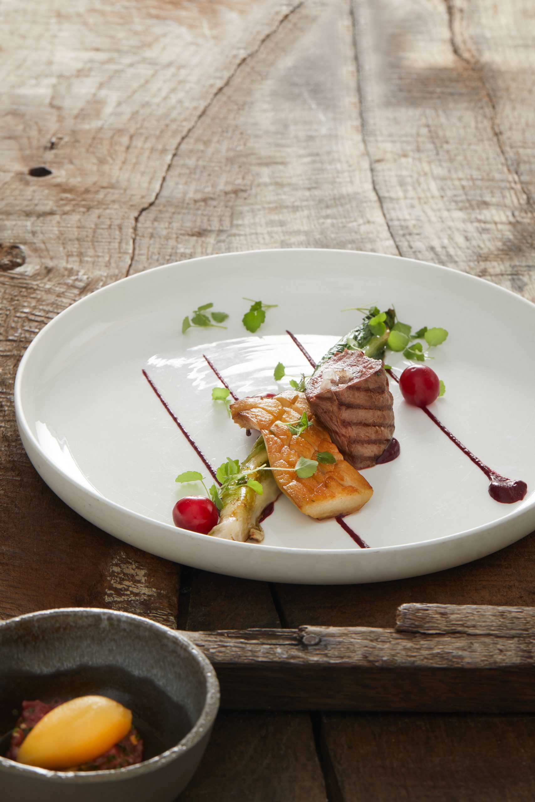 La Côte de cochon ibérique : grillé/fumé et Dim sum cochon/calamar, poireaux, curry vert d’épinard au jus de lime, condiment passion/cacahuète